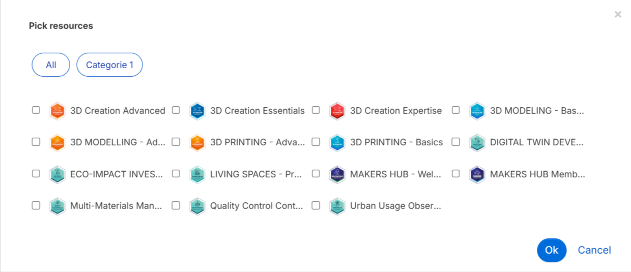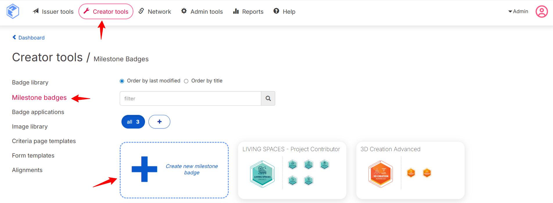 After this, click Creator tools and choose Milestone badges. Click Create new milestone badge. Choose a badge from your badge library. Then add the required badges in the pathway which need to be earned for the milestone badge. You can easily make a multiple selection by ticking the relevant badges or using the categories created in your badge library.