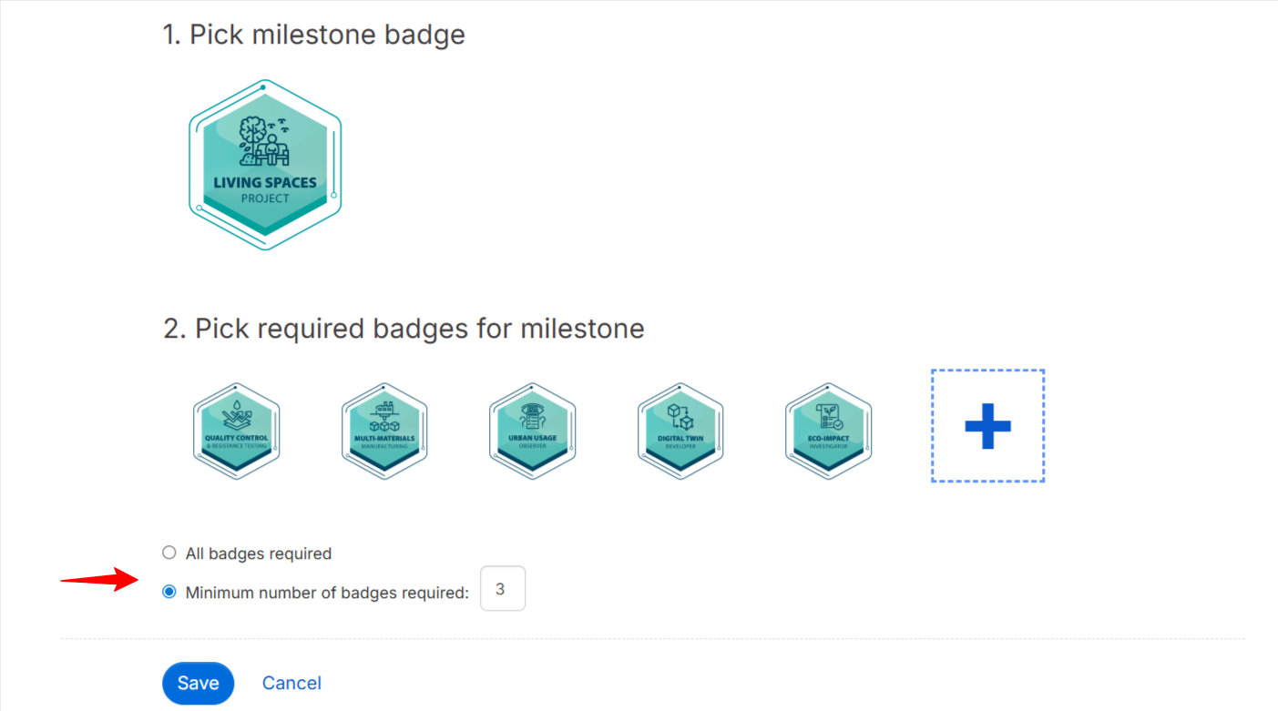 It’s possible to require specific badges to be earned to get the milestone badge (all), or a specific amount of badges from a group of badges (for example, three badges out of five need to be earned in order to get the milestone badge). Save the new milestone badge at the end.