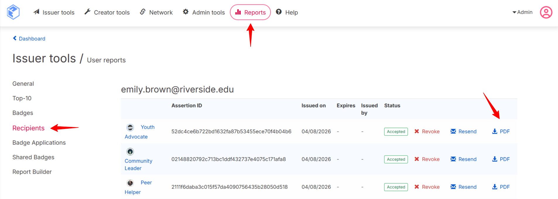 Please note that you can, from the Reports / Recipients section, download the badge obtained by a beneficiary in PDF format (see screenshot below).