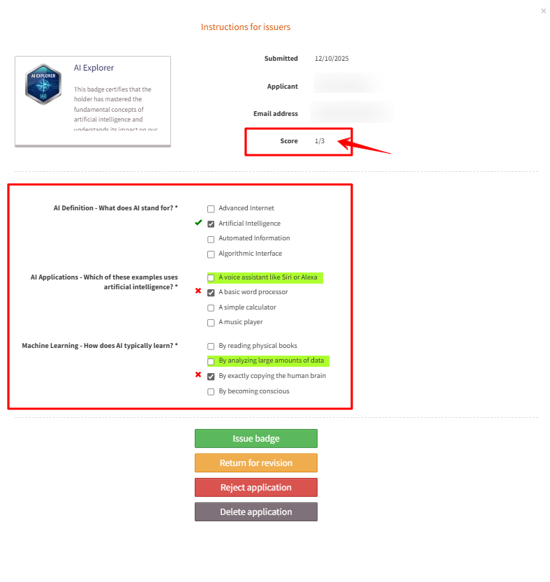 To review a badge application that includes a quiz and check the responses, you must select the "After review" approval method when creating the application form. To review the responses, follow the standard procedure: Issuer Tools / Review applications, then click on the application you wish to review.
