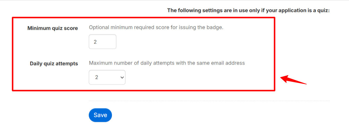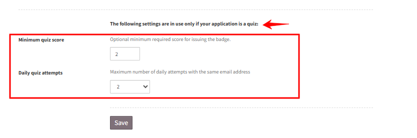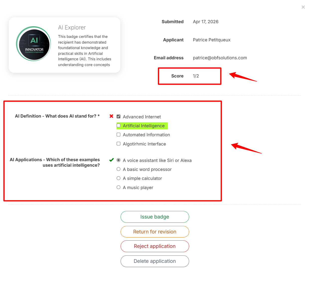 At the Pro level, you can combine automatic badge issuance with automatic quiz grading. If the required score is achieved (as defined by the badge application creator), the badge is automatically issued.