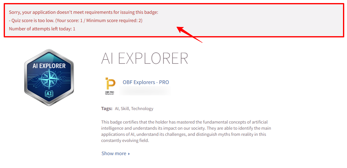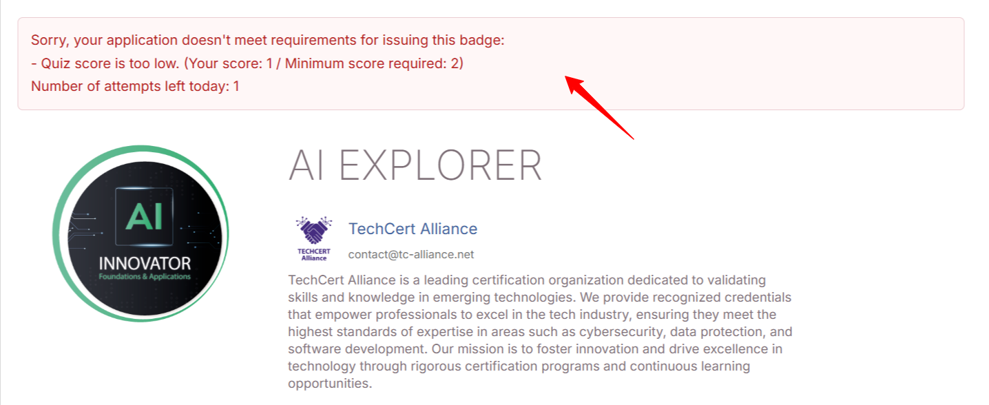 If an applicant has already passed the quiz and earned the badge, any subsequent application will automatically result in badge issuance, even if they fail the quiz on this second attempt. Since the applicant has already demonstrated that they meet the earning criteria through their initial success, they retain this qualification. This allows, for example, reissuing a badge that was accidentally deleted.