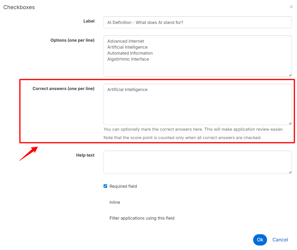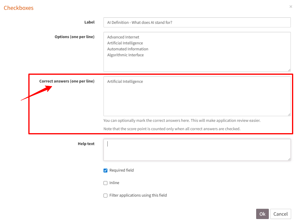 Creating a quiz using Checkboxes is preferable if you want to give the applicant the option of ticking several answers. Enter the title of your question in the ‘Label’ field and specify the answer choices in the ‘Options’ field. Give only one choice per line.