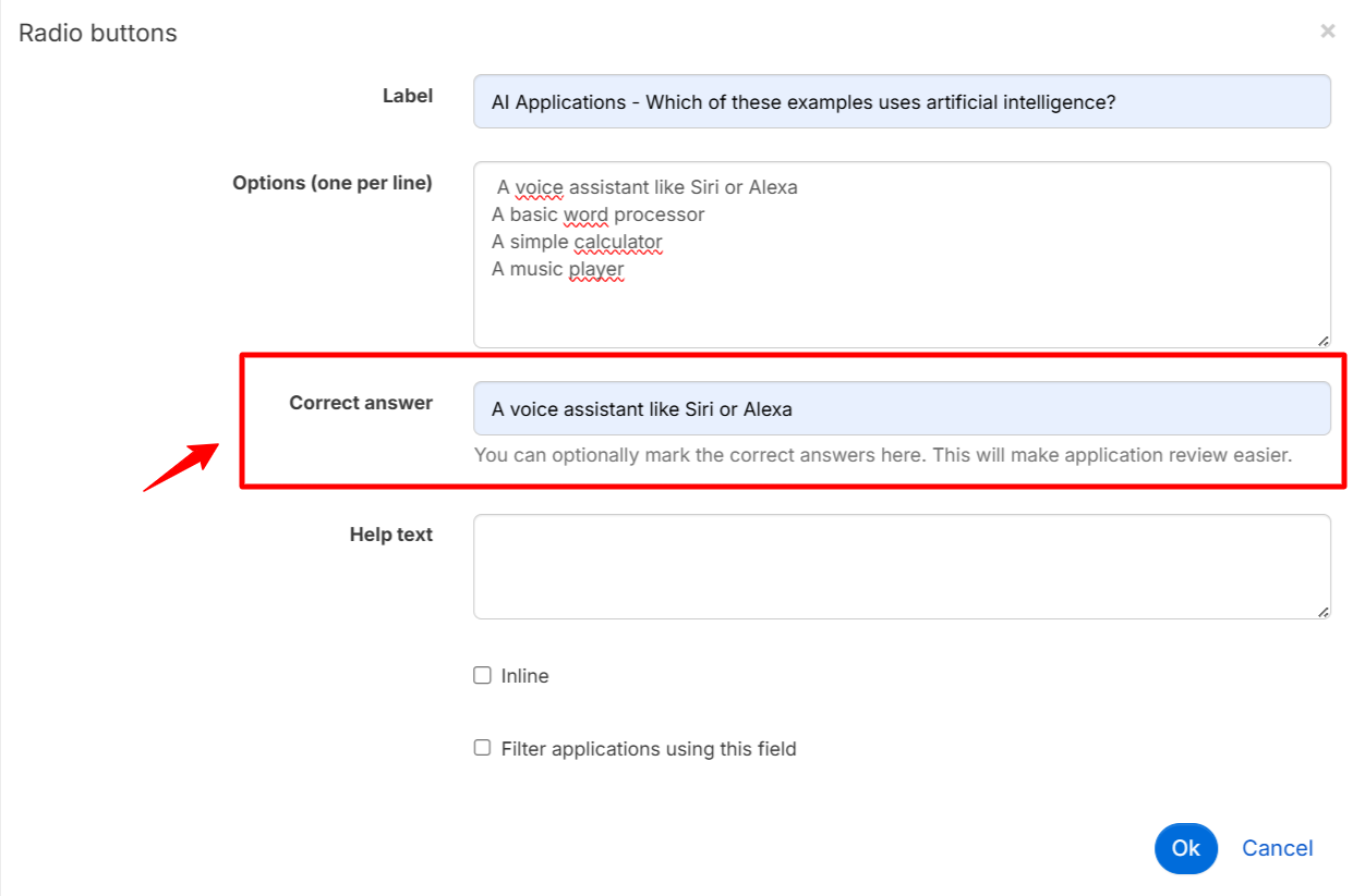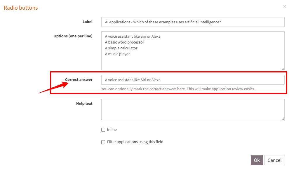 You can define whether the answer to this question is compulsory by ticking the ‘Required field’ box, choose an inline presentation of the options and answers by ticking the ‘Inline’ box, and finally, filter the sending of the badge application to particular reviewers on the basis of this question by ticking the ‘Filter applications using this field’ box.