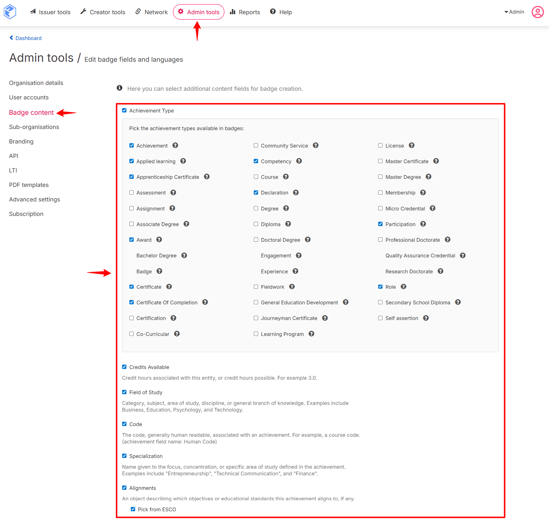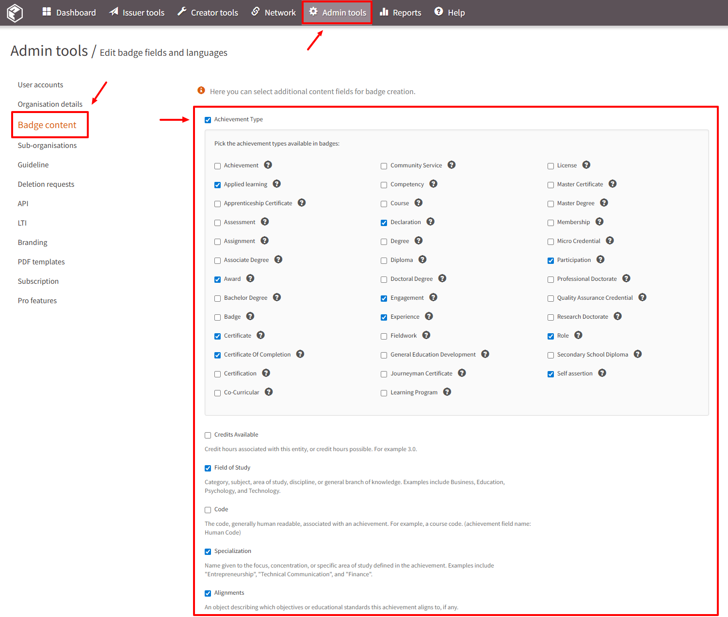 In Admin Tools > Badge Content, you can enable additional fields to enrich your badges with extra information, such as available credits, field of study, a human-readable code, or a specialization. These fields help better describe and showcase the skills or achievements recognized by your badges.