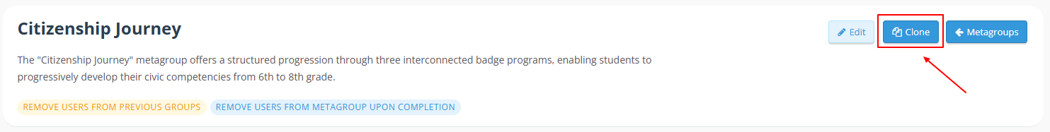 You can clone an existing metagroup. This creates a copy including all groups and progression rules. However, members and invitation badges will not be duplicated.