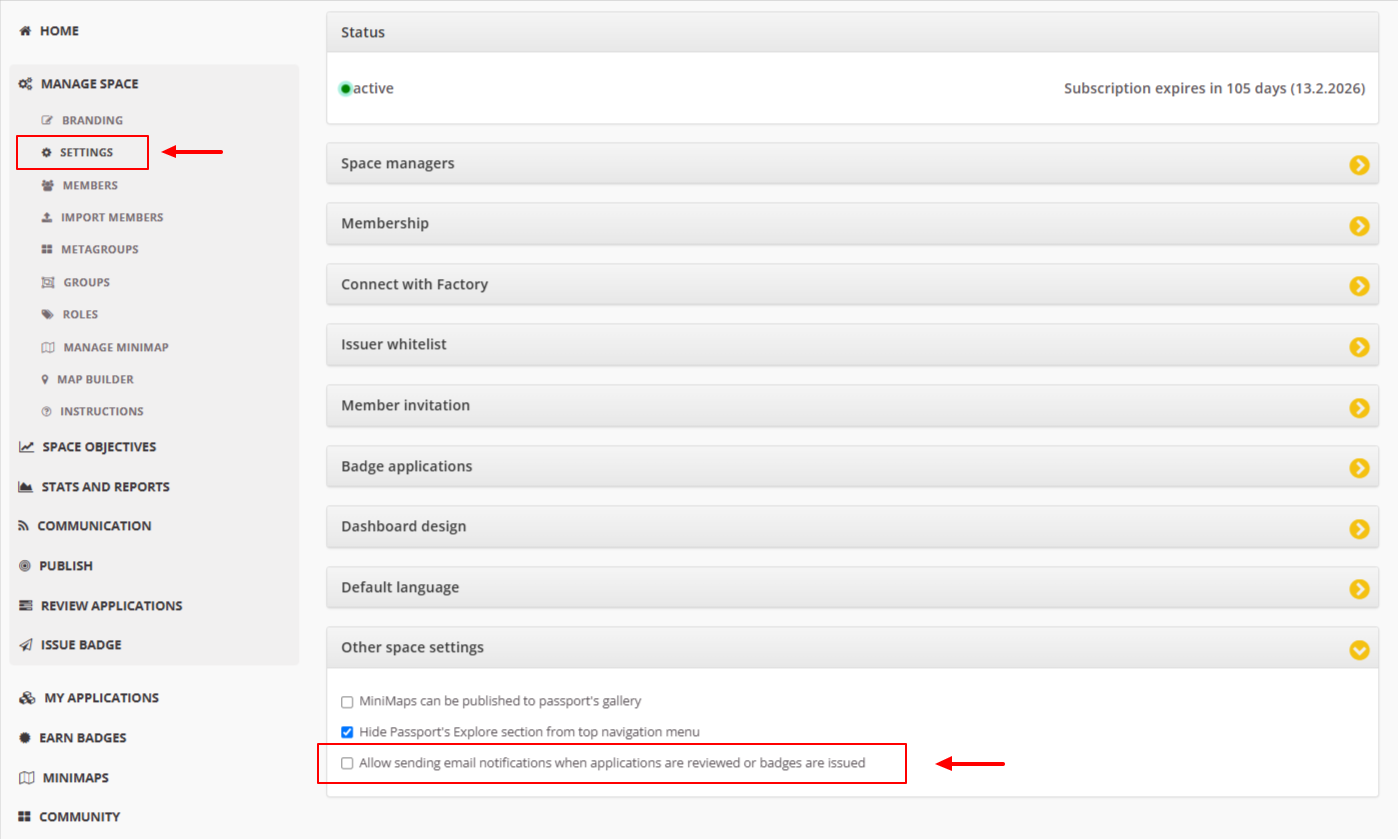 To inform members of your Space that their badge requests have been reviewed or that a badge has been issued to them, you must enable the option 'Allow sending email notifications when applications are reviewed or badges are issued ' in the environment settings: Manage Space / Settings / Other space settings.