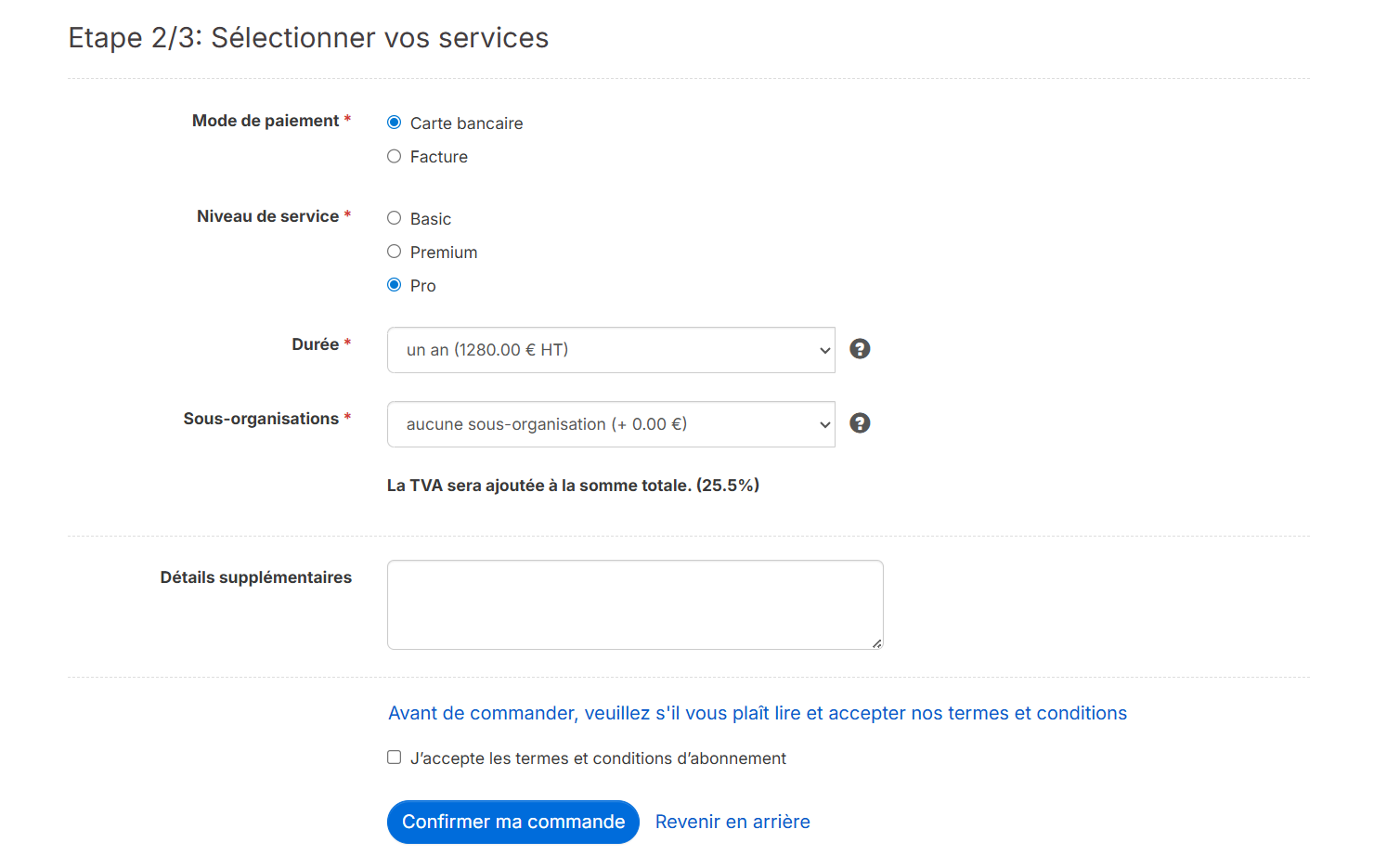 Vous pourrez indiquer ensuite le niveau de service souhaité ainsi que toutes les informations relatives aux modalités de paiement : carte bancaire ou facturation.