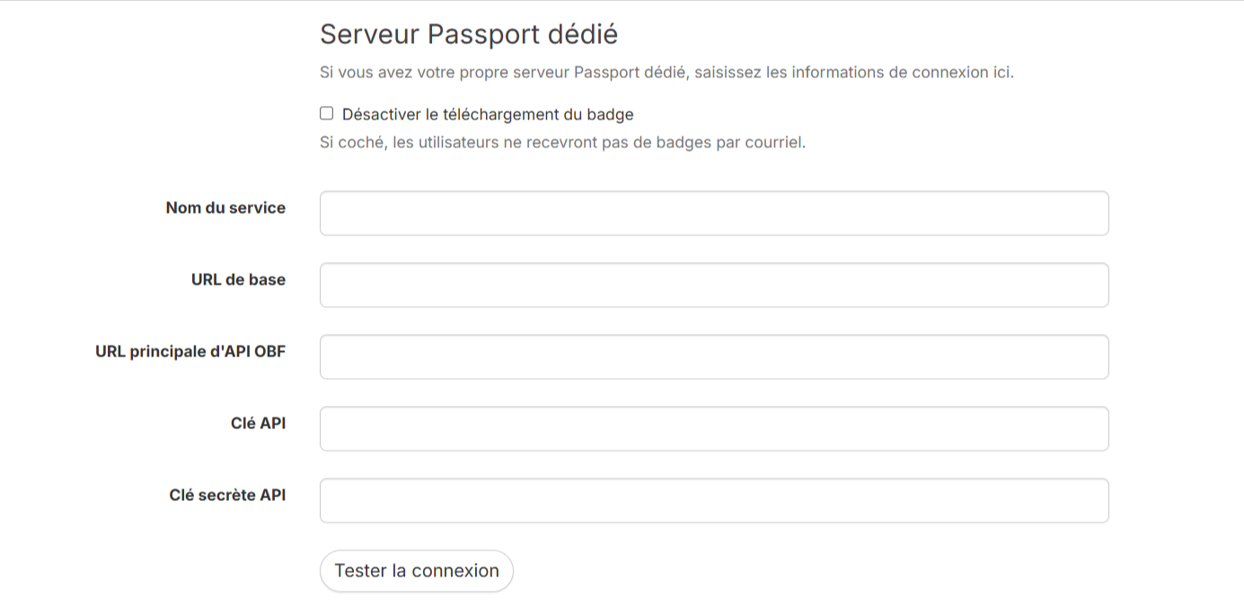 Si votre organisation dispose de sa propre instance dédiée d'Open Badge Passport, utilisez cette section pour configurer la connexion :