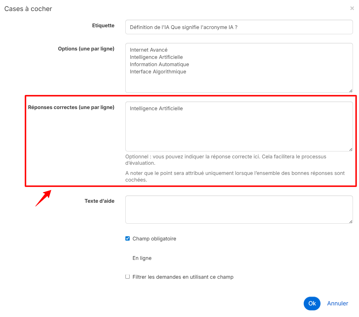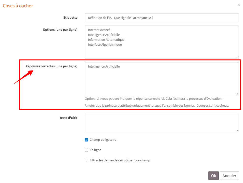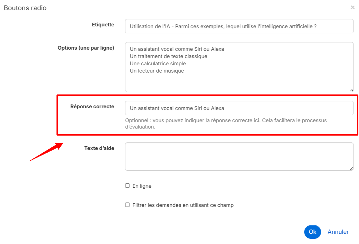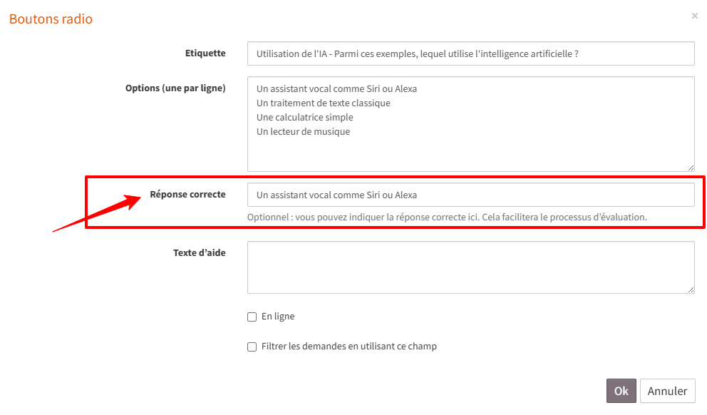Vous pouvez ajouter un texte d'aide à votre question en le saisissant dans le champ « Texte d'aide ».