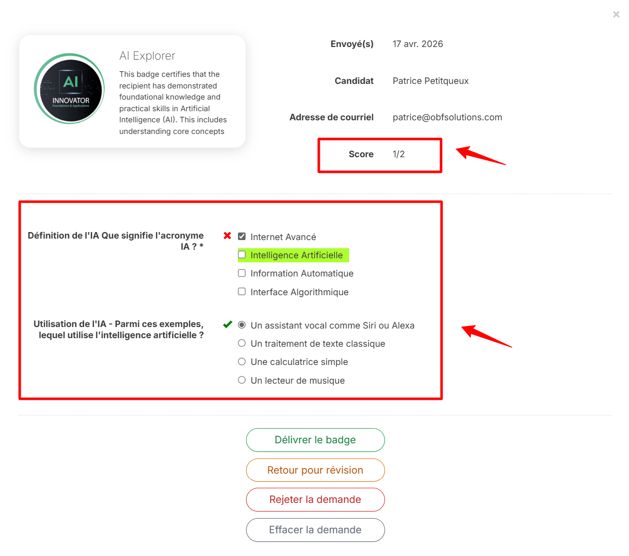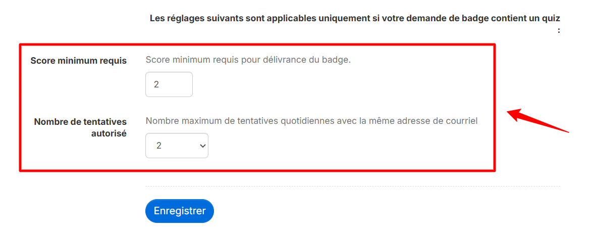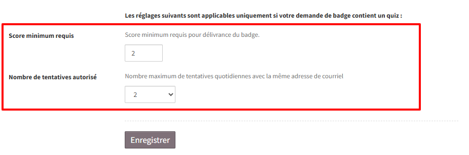 Au niveau Pro, vous pouvez combiner l'émission automatique d'un badge avec la correction automatique du quiz. Si le score requis est atteint (tel que défini par le créateur du formulaire de demande de badge), le badge est automatiquement délivré.