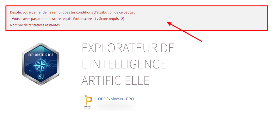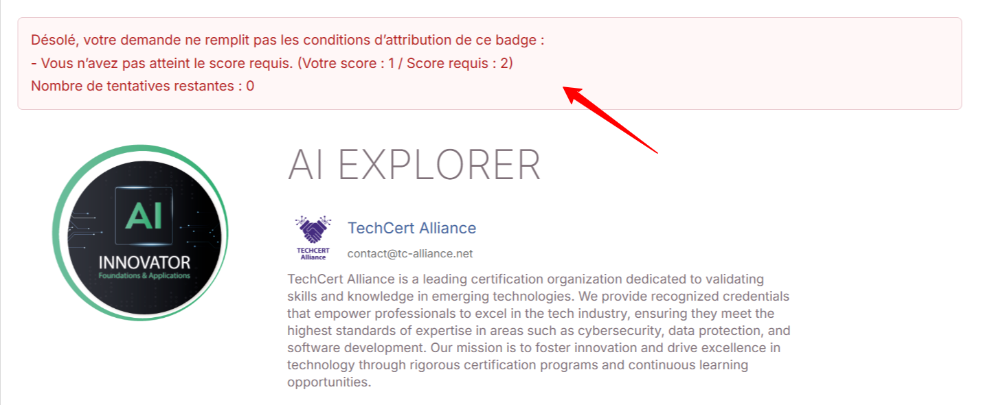 Si un candidat a déjà réussi le quiz et obtenu le badge, toute nouvelle demande aboutira automatiquement à la délivrance du badge, même en cas d'échec au quiz lors de cette seconde tentative. Le candidat ayant déjà démontré qu'il répondait aux critères d'obtention lors de sa première réussite, il conserve cette qualification. Cela permet notamment de réémettre un badge supprimé par erreur.