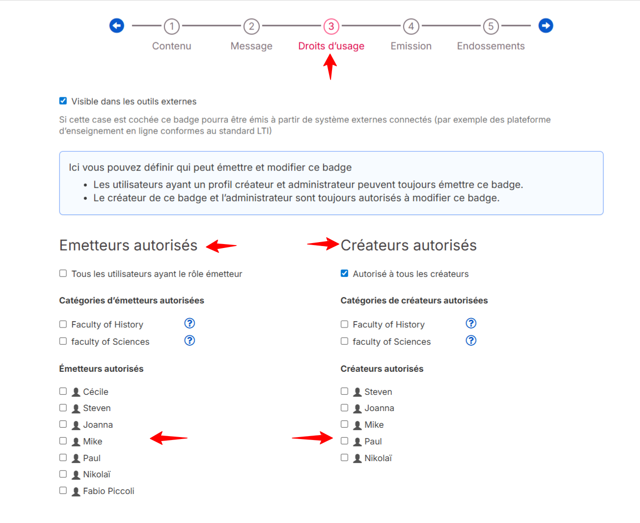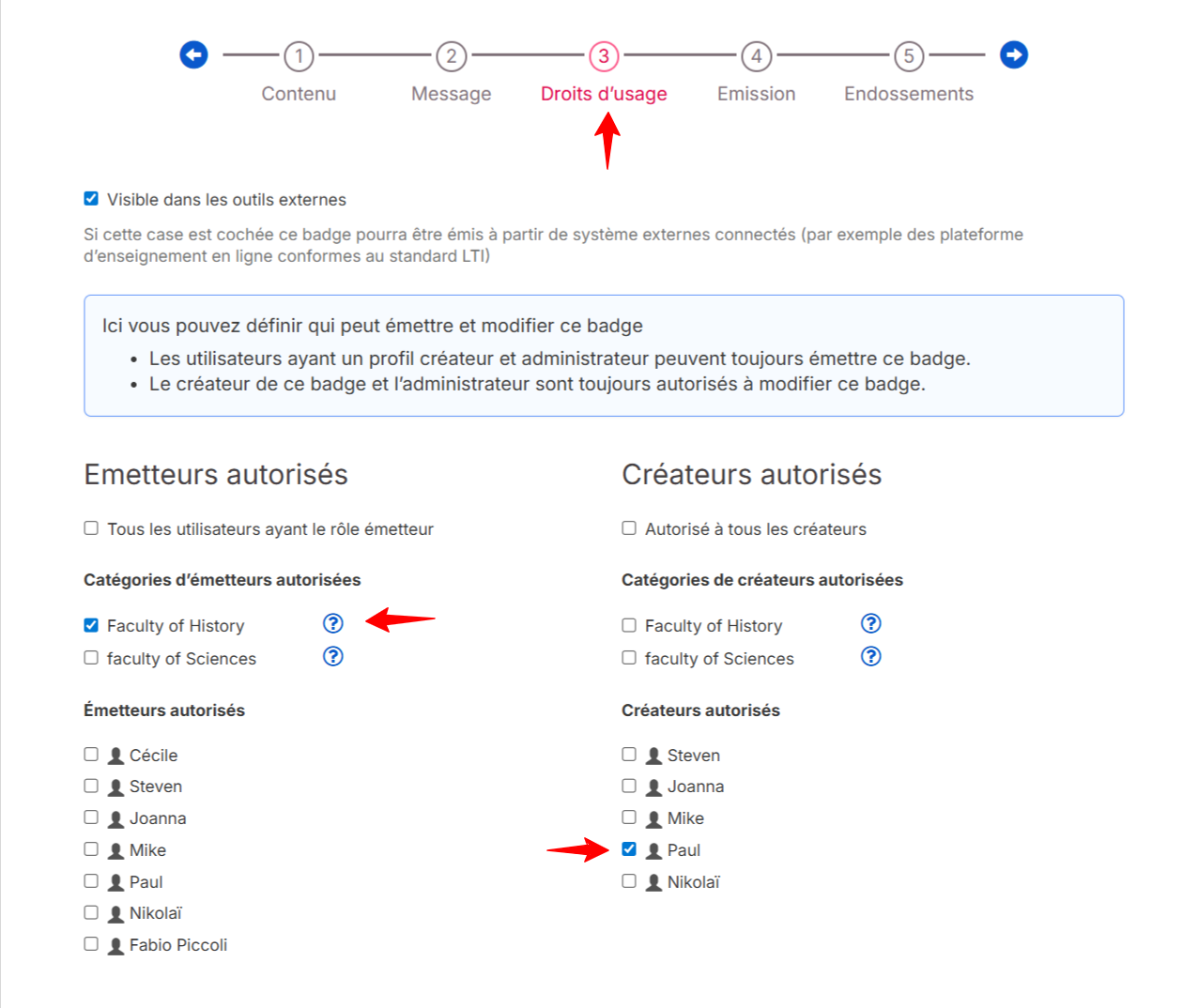 Note importante : Un créateur qui n'a pas l'autorisation de modifier un badge conserve néanmoins le droit de l'émettre.