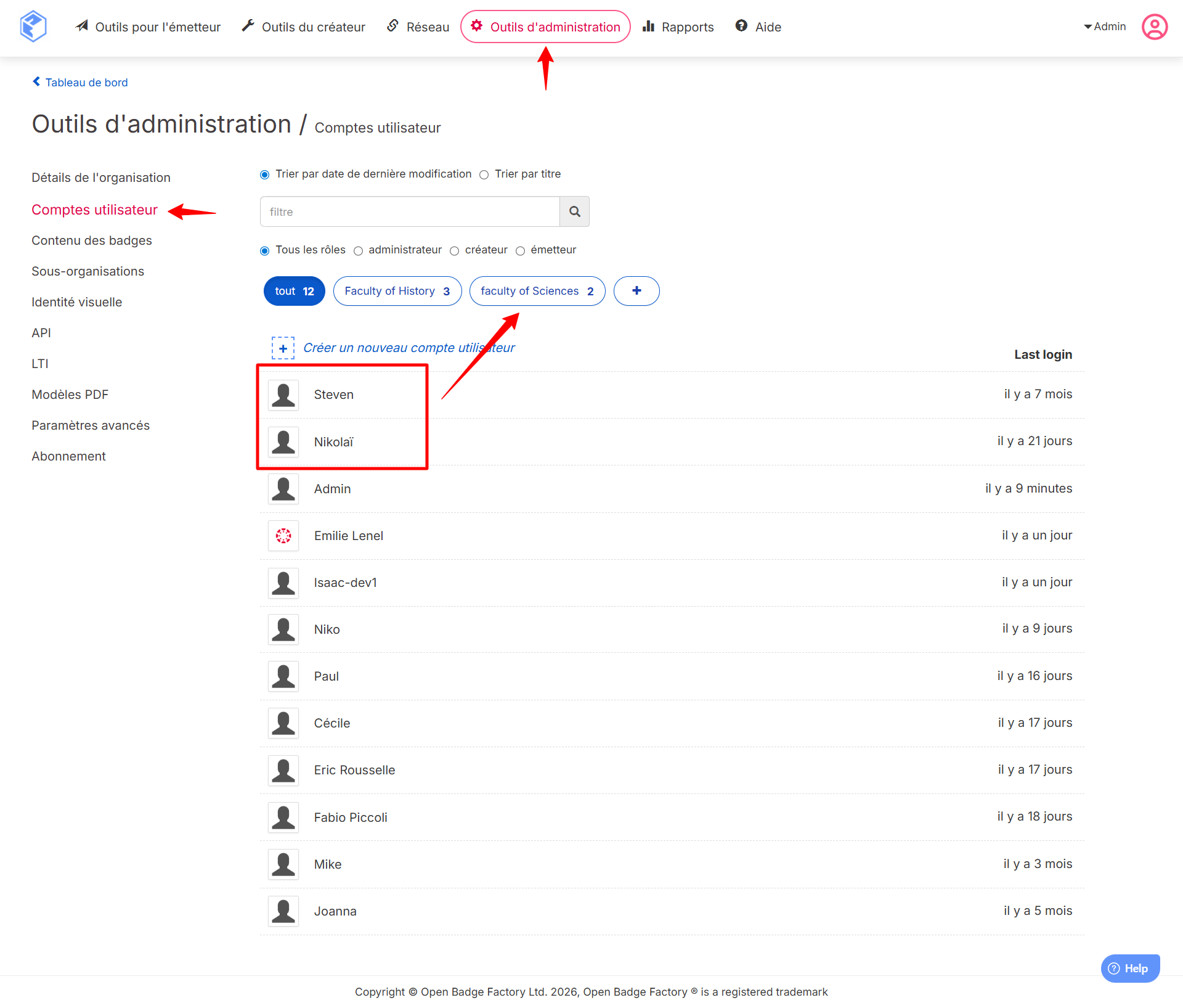 Les utilisateurs ayant le rôle Admin disposent de tous les droits : ils peuvent créer, modifier et émettre l'ensemble des badges du compte.
