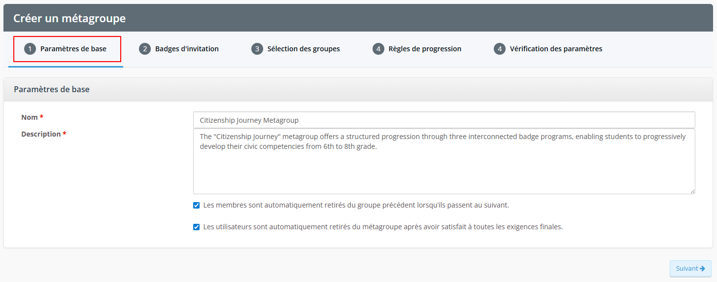 - Paramètres de base : Créez le métagroupe en cliquant sur le bouton « Créer un métagroupe » et en remplissant le nom et les informations de base.