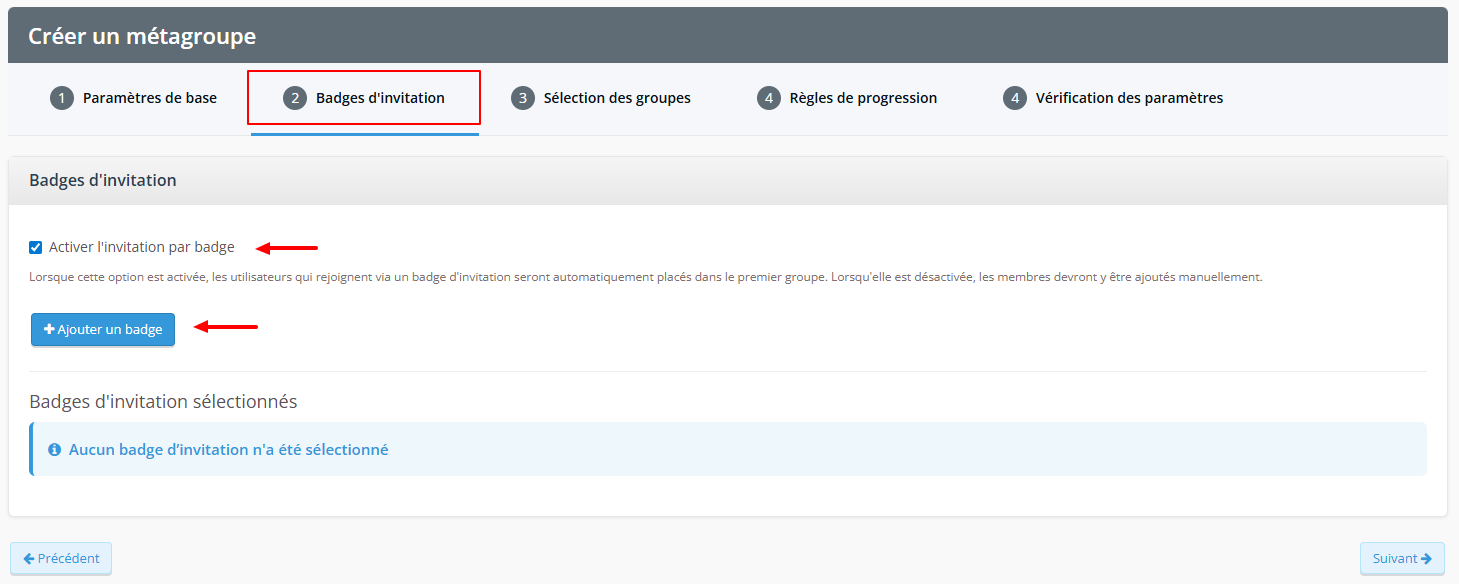 Le créateur du métagroupe peut spécifier si l'ajout de membres nécessite un badge d'invitation. Pour activer cette fonctionnalité, cochez l'option Activer l'invitation par badge (voir la capture d'écran ci-dessous).