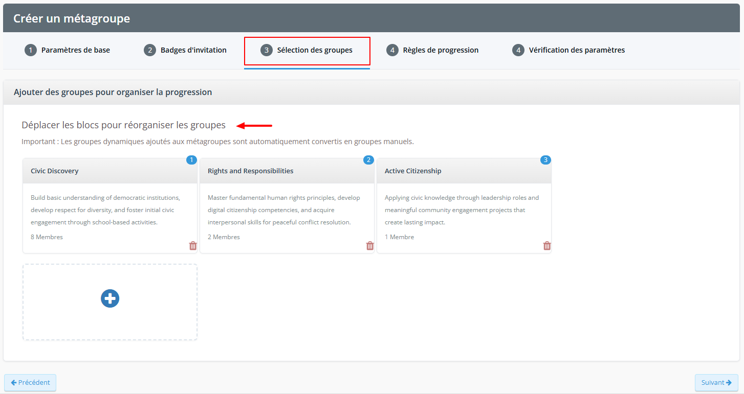 - Sélection des groupes : Ajoutez des groupes et ordonnez-les pour construire les étapes de progression de votre parcours.