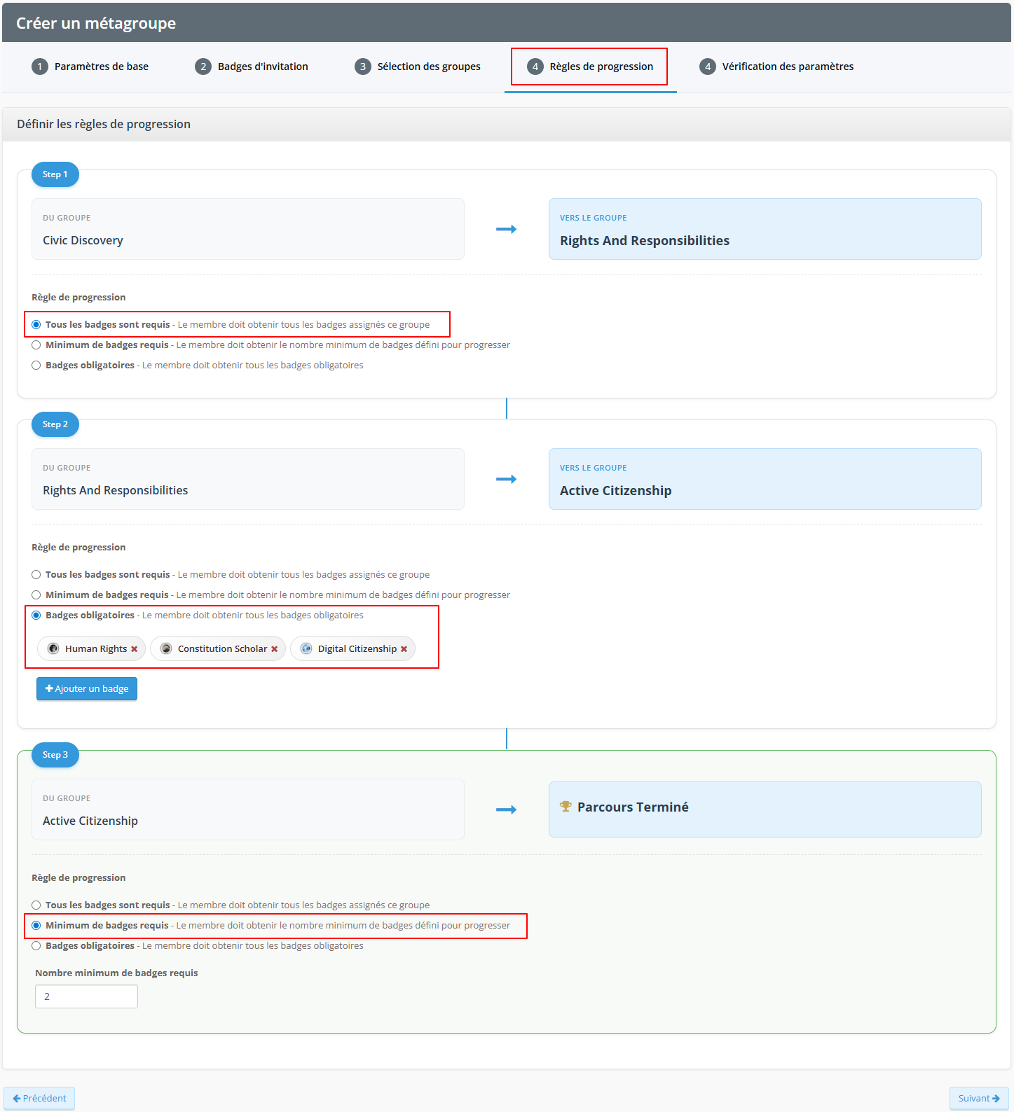 - Règles de progression : Définissez les règles de progression entre les groupes.