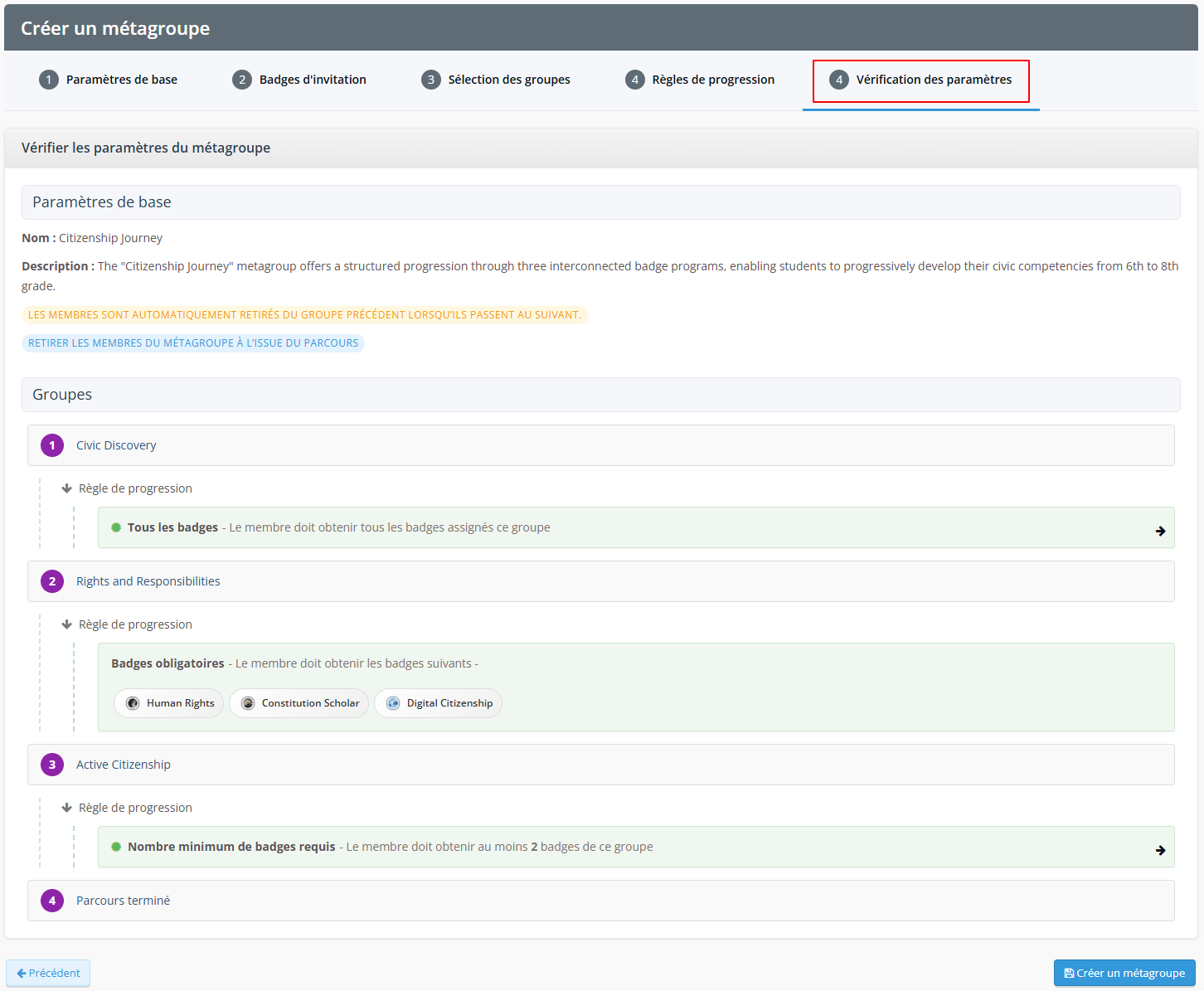 Cette étape fournit un aperçu des paramètres de votre métagroupe. Vous pouvez modifier votre configuration en utilisant le bouton Précédent, ou cliquer sur Créer un métagroupe pour finaliser la configuration (voir la capture d'écran ci-dessous).